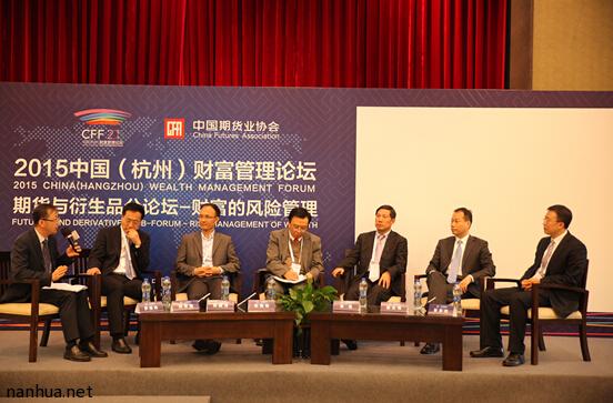 3月28日,2015中国财富管理论坛在杭州隆重举行,主办单位之一的中国期货业协会承办了以“财富的风险管理”为主题的期货与衍生品分论坛。中国期货业协会会长刘志超发表致辞,世界金融期货之父、南华期货战略顾问利奥·梅拉梅德、国务院学科评议组成员、厦门大学金融工程教授郑振龙等嘉宾发展主题演讲。南华期货总经理罗旭峰主持圆桌论坛,副总经理颜树萍、副总经理朱斌、首席风险官吴琎参加会议。