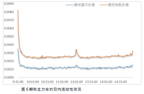 可能部分投资者还十分关注期权合约的日内流动性变动状况,我们统计了主力合约日内分时的流动性状况,以盘口绝对价差为标准,可以发现往往在开盘后收盘时盘口价差会有所扩大,尤其是早盘开盘时流动性较差,而日内的盘口价差基本稳定,反映出做市商在日内良好的完成了连续报价的任务。