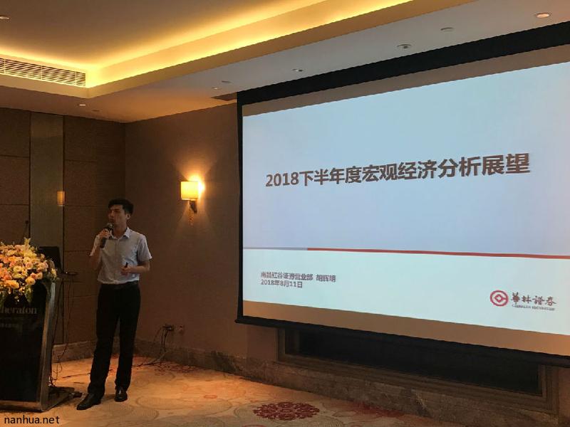 华林证券南昌营业部总经理胡辉明则从货币增速下降对我国的影响、对A股未来的看法两方面带来了“2018下半年度宏观经济分析展望”主题演讲。除详细讲述人民币持续贬值对我国的影响外,胡辉明结合图表分析了2008年金融危机以后全球主要股票市场的走势,并就今年下半年金融市场的投资策略分享了自己的经验。