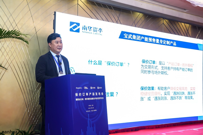 随后,上海钢铁交易中心副总经理黄科力和南华资本总经理尚立峰分别针对保价订单产品进行介绍。黄科力表示,实体企业参与场外期权交易的难点痛点,一是权利金贵,二是普通客户理解期权原理难。“经过半年多的努力,我们创新了一款新的产品,这款产品是基于宝武集团产能预售业务,很接地气,客户一听就懂,一学就会,一键操作。”黄科力说。通过这款产品,上海钢铁交易中心希望与期货公司等金融机构之间形成“你的产品,我的客户,你的业务,我的服务”这样一种新型的依存关系,更好地促进金融服务实体经济。