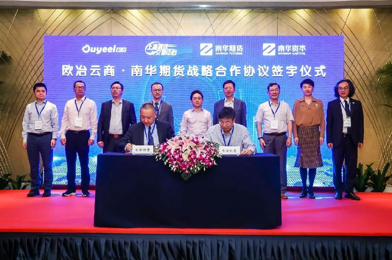 南华期货总经理李北新与欧冶云商高级副总裁潘智军,在上海期货交易所副总经理贺军、大宗商品服务部总监鲍建平、欧冶云商党委书记、董事长赵昌旭、总裁、党委副书记金文海、高级副总裁张佩璇以及钢厂、终端用户和贸易商代表的见证下,进行了欧冶云商·南华期货战略合作协议的签订。