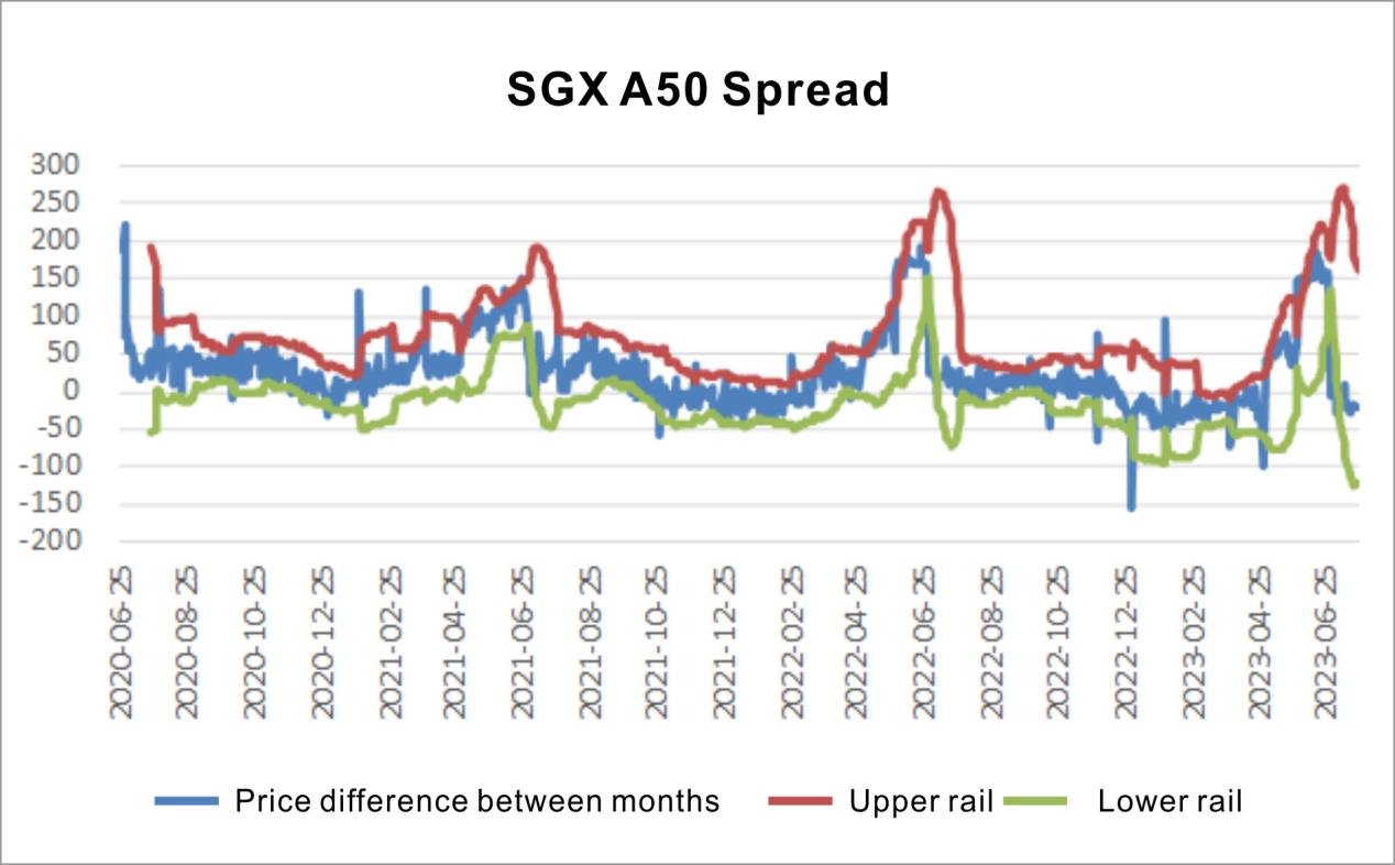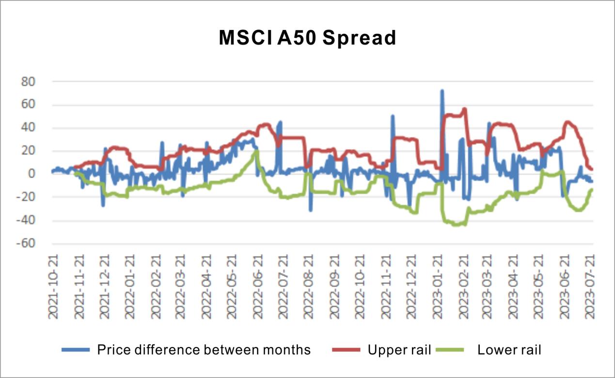 Intertemporal arbitrage: The upper and lower Bollinger band ranges of the FTSE China A 50-month price difference: [ -122, 163], the upper and lower Bollinger band ranges of the M SCI China A 50-month price difference: [ -13, 5]. It is recommended that the price difference break through this range for arbitrage.