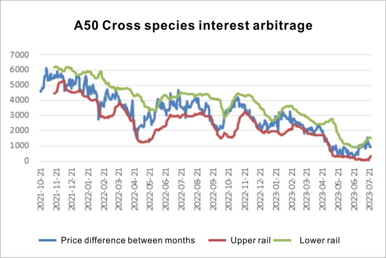 Cross-variety arbitrage: SGXA50- M SCI China A 50 cross-species price spread Bollinger upper and lower track range: [357, 1488], the current cross-species is in a unilateral market, it is recommended to wait and see.